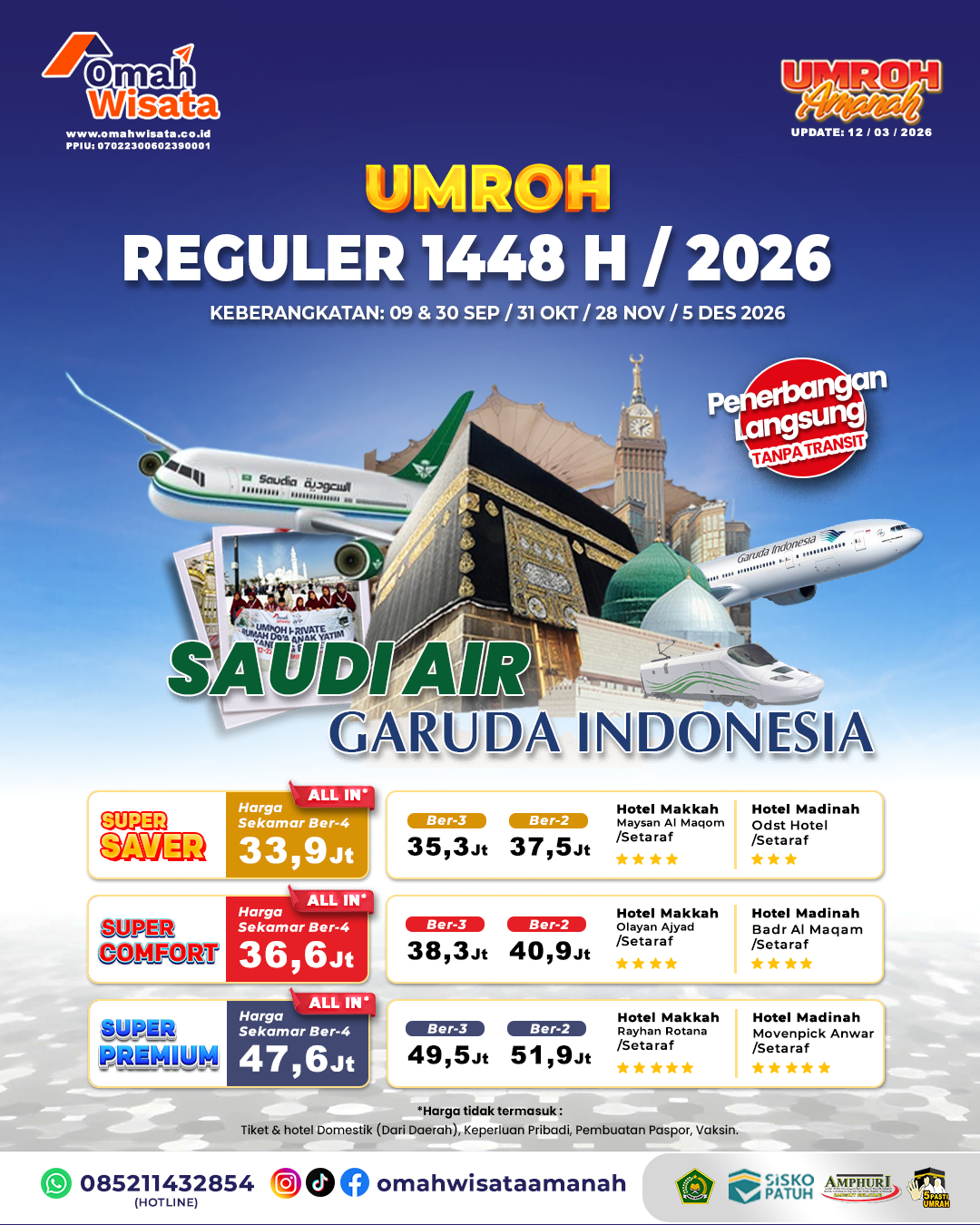 Umroh Regular Awal Musim 1448 H bersama Omah Wisata Amanah hadir dengan pilihan keberangkatan pada 17 & 30 Juni, 08 & 29 Juli, serta 05 Agustus 2026 menggunakan maskapai Oman Air dan Qatar Airways (penerbangan transit). Tersedia beberapa pilihan paket mulai dari Super Saver Rp29,9 juta, Super Comfort Rp33,7 juta, hingga Super Premium Rp45,5 juta per jamaah (sekamar ber-4) dengan fasilitas hotel pilihan di Makkah dan Madinah yang nyaman dan strategis. Program ini sudah ALL IN sehingga memudahkan jamaah dalam mempersiapkan perjalanan ibadah ke Tanah Suci dengan pelayanan terbaik dari tim profesional. Segera amankan kursi keberangkatan Anda dan wujudkan impian beribadah di Baitullah bersama Omah Wisata Amanah.